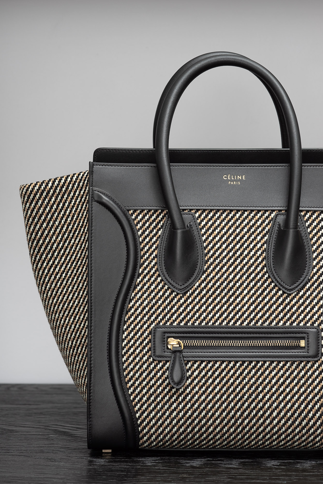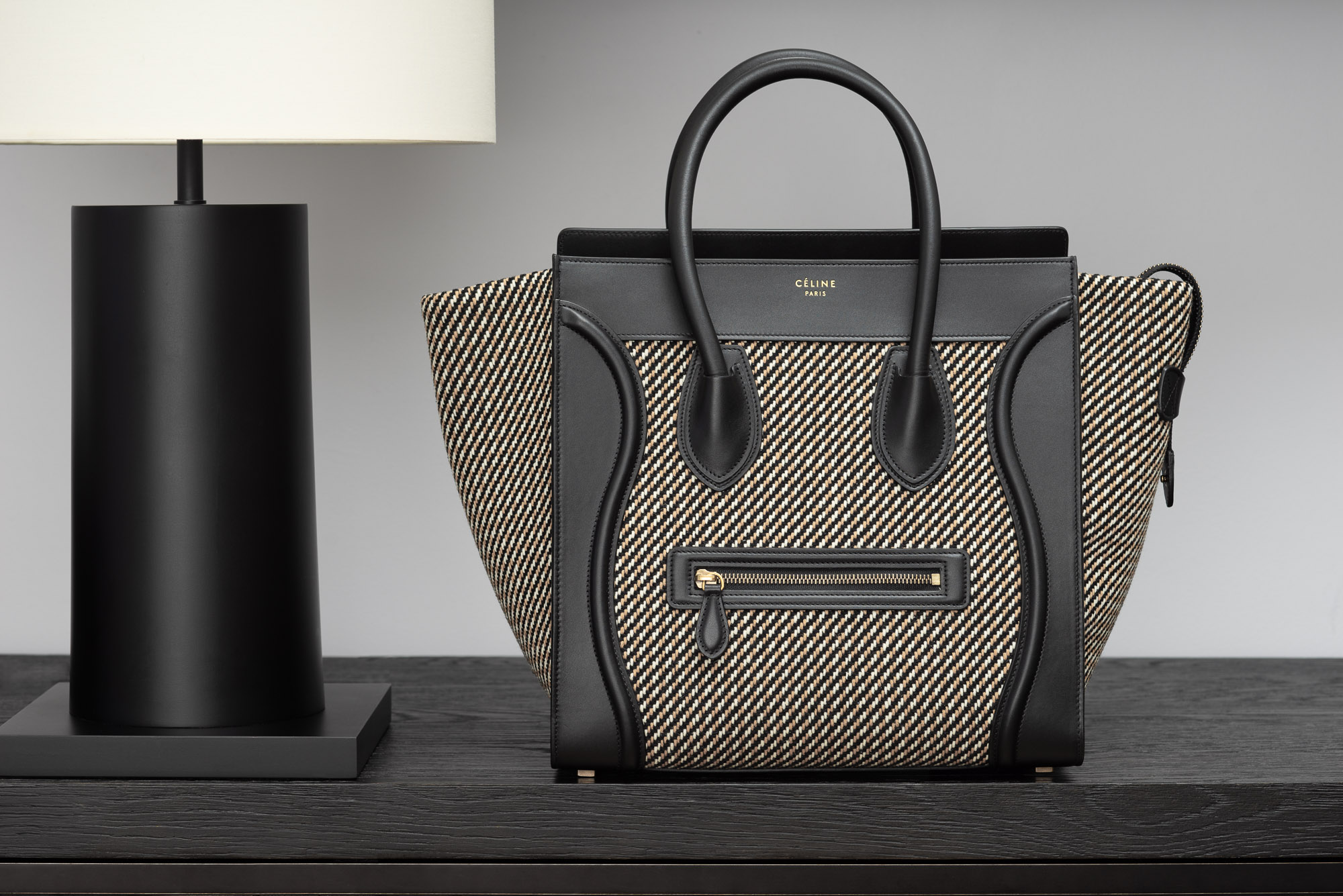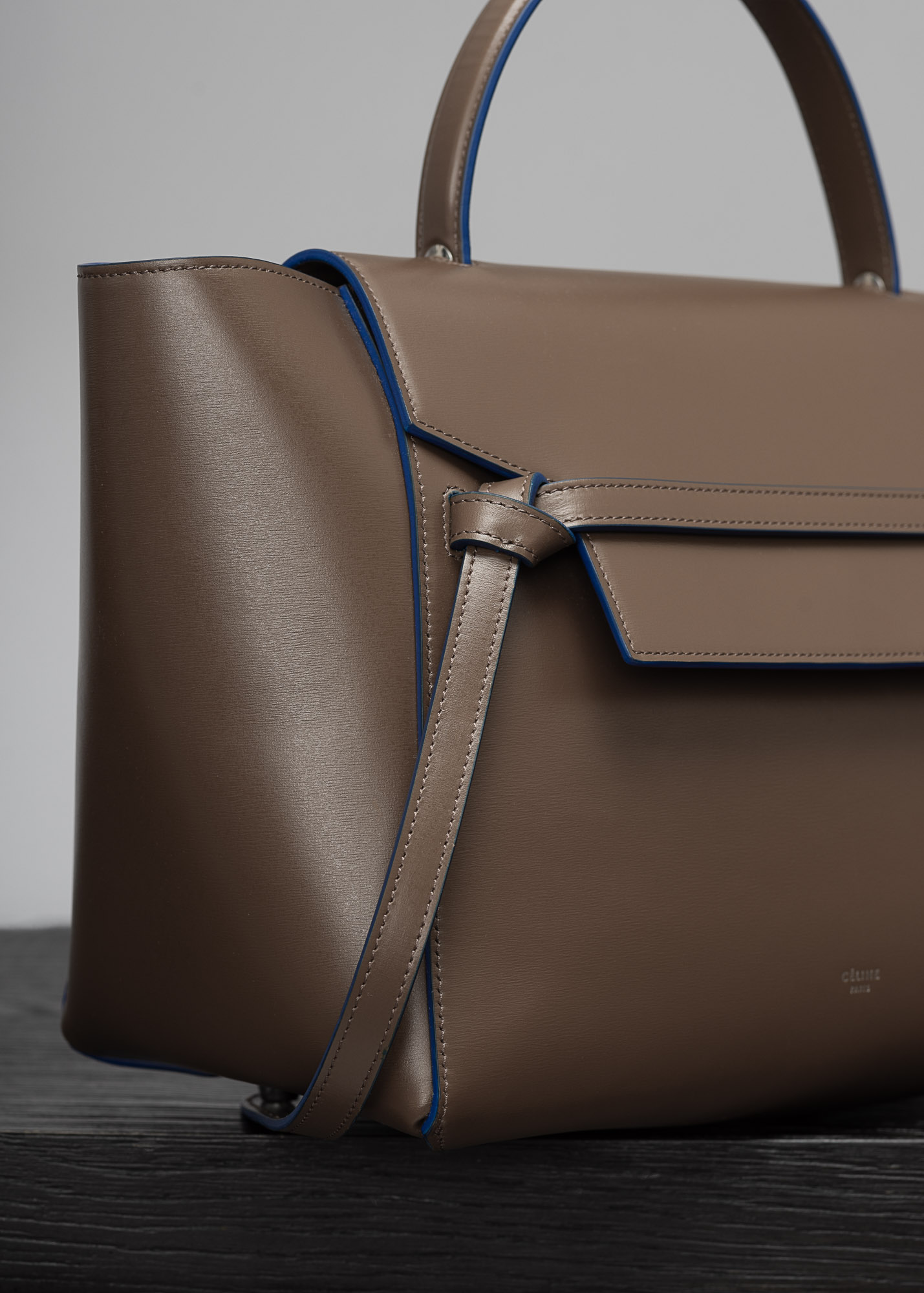 Mini belt bag in palmelato calfskin with a leather handle, a removable shoulder strap, and a zipped outer pocket on the back. The bag closes two ways: top flap and zipper.